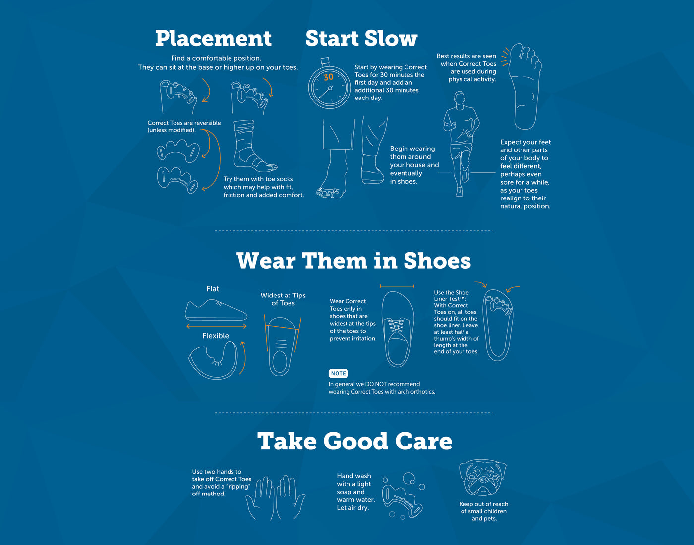 Positive changes require time and are not without a few aches along the way. Anticipate using Correct Toes regularly during the transition to new footwear. Throughout the first few months, progressive use of the device will begin to yield changes in alignment.